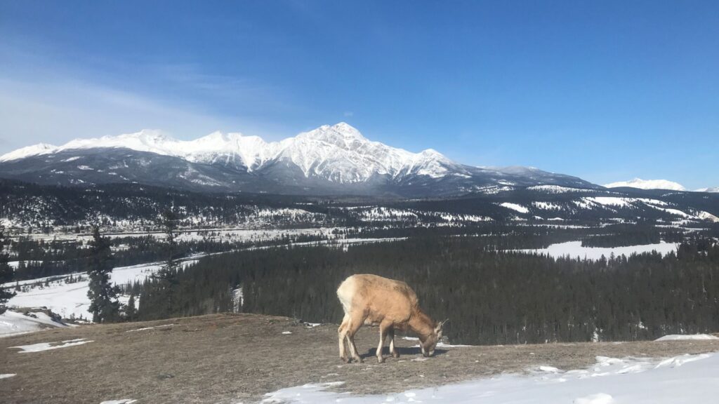 ジャスパーの山頂からの景色とヤギ アルバータ州