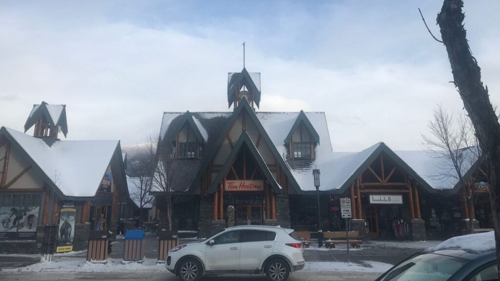 歩いていて印象に残ったのが、カナダで有名なチェーン店 Tim Hortons(ティム・ホートンズ) の外観。ジャスパーの店舗は木を使ったログハウスのようなデザインで、他の都市の雰囲気とはまったく違っていました。