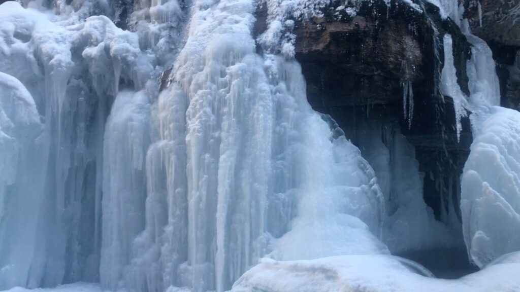 ジャスパーで「手軽に絶景を見たい」という人におすすめなのが、Maligne Canyon(マリーン渓谷) です。深さ50mほどの細い渓谷の上を歩きながら、滝や急流を近くで見ることができる人気トレイルです。冬は写真のように迫力のある氷瀑を見ることができます。